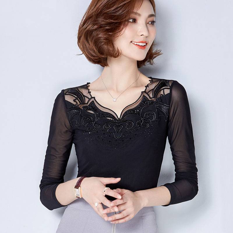 韩美格2017春秋新款修身大码蕾丝网纱打底衫女长袖薄款圆领女T恤 全店商品 二件减5元 三件减10