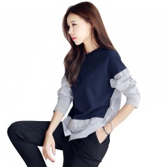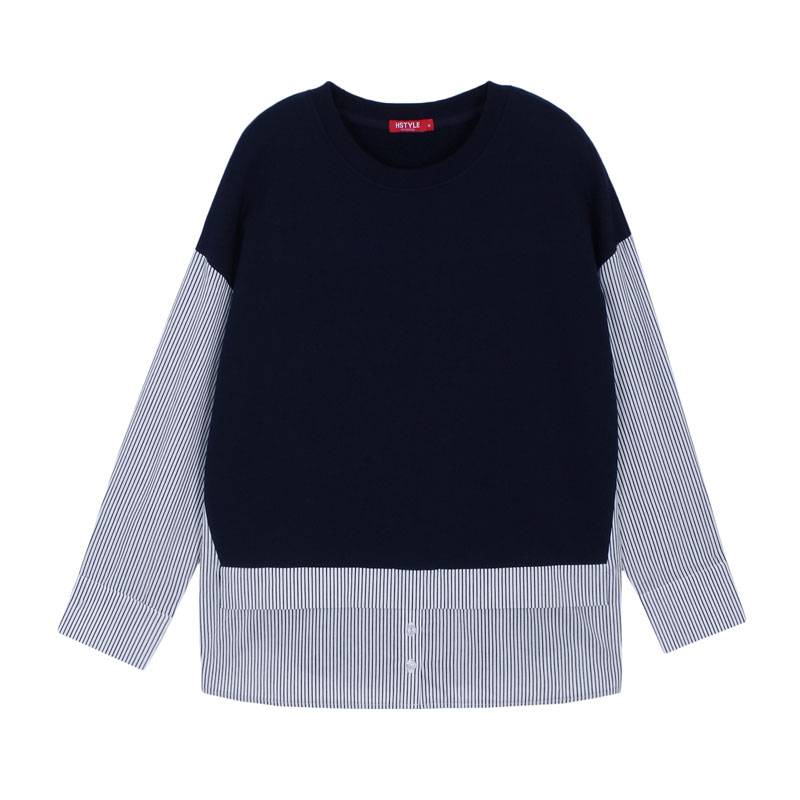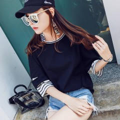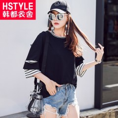 韩都衣舍2018新款女装秋韩版条纹假两件秋天黑色短袖T恤