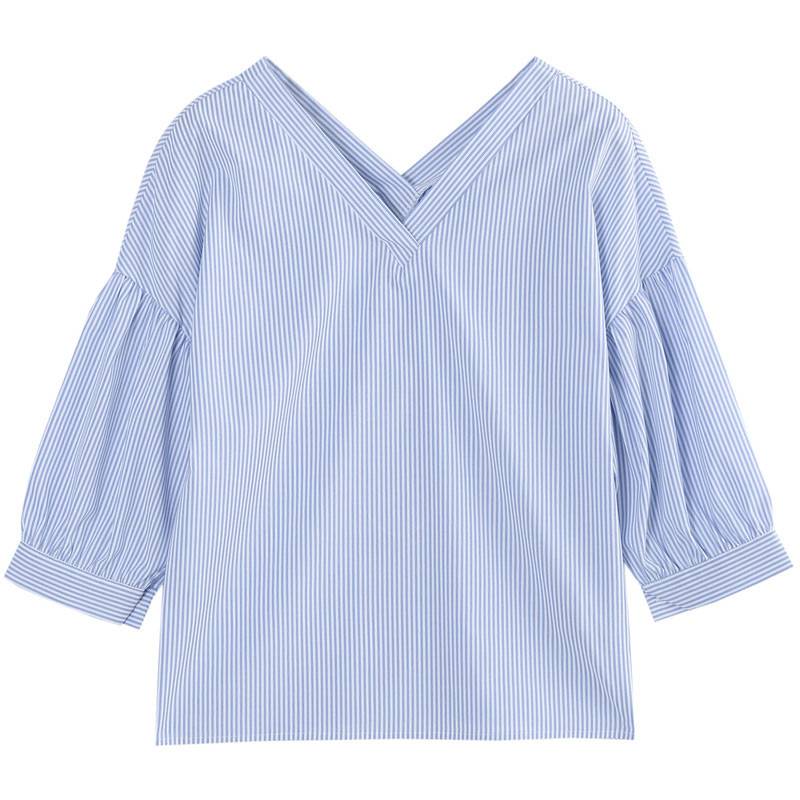 韩都衣舍2017韩版女装春装新款条纹显瘦百搭宽松v领七分袖衬衫潮 领券立减/单件包邮/七天无理由退换
