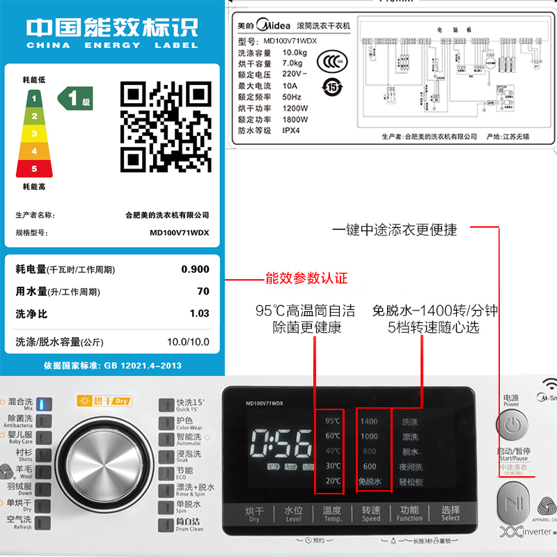 商品名称:Midea/美的MD100V71WDX 10公斤变频滚筒洗衣机全自动家用洗烘一体